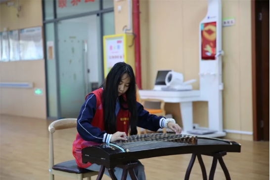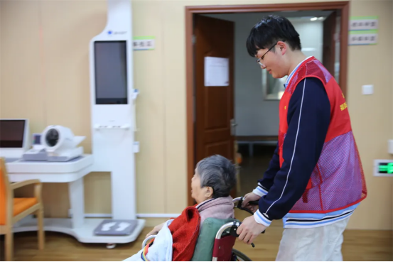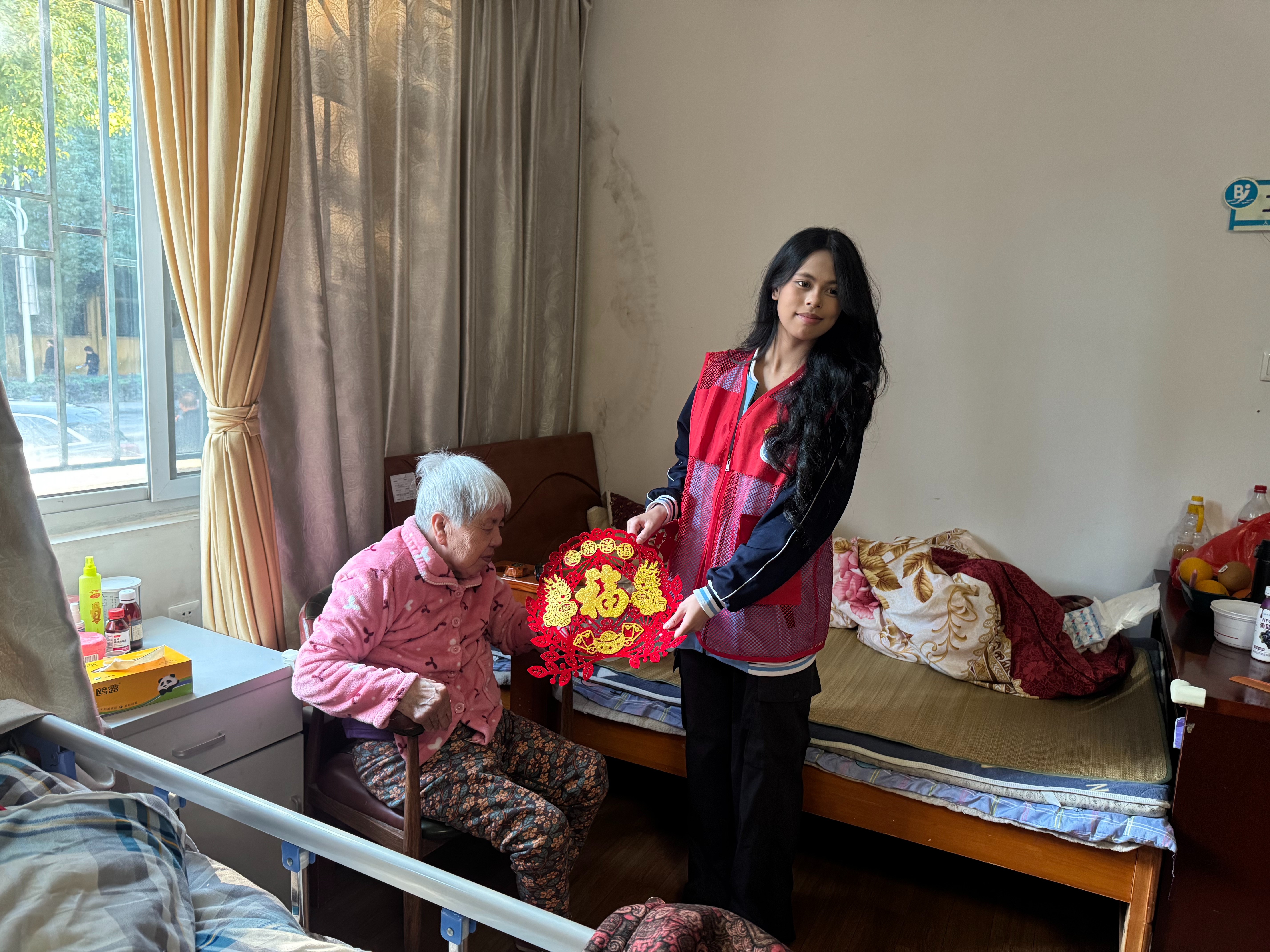 节目表演结束后,志愿者们分组行动,深入到老人的房间和各个休闲区域,细心地为行动不便的老人整理床铺、掖好被角,俯下身耐心地陪爷爷奶奶们唠家常,认真倾听他们讲述过去的故事。一抹抹“志愿红”的穿梭与陪伴,让整个照料中心充满了温馨的亲情氛围。