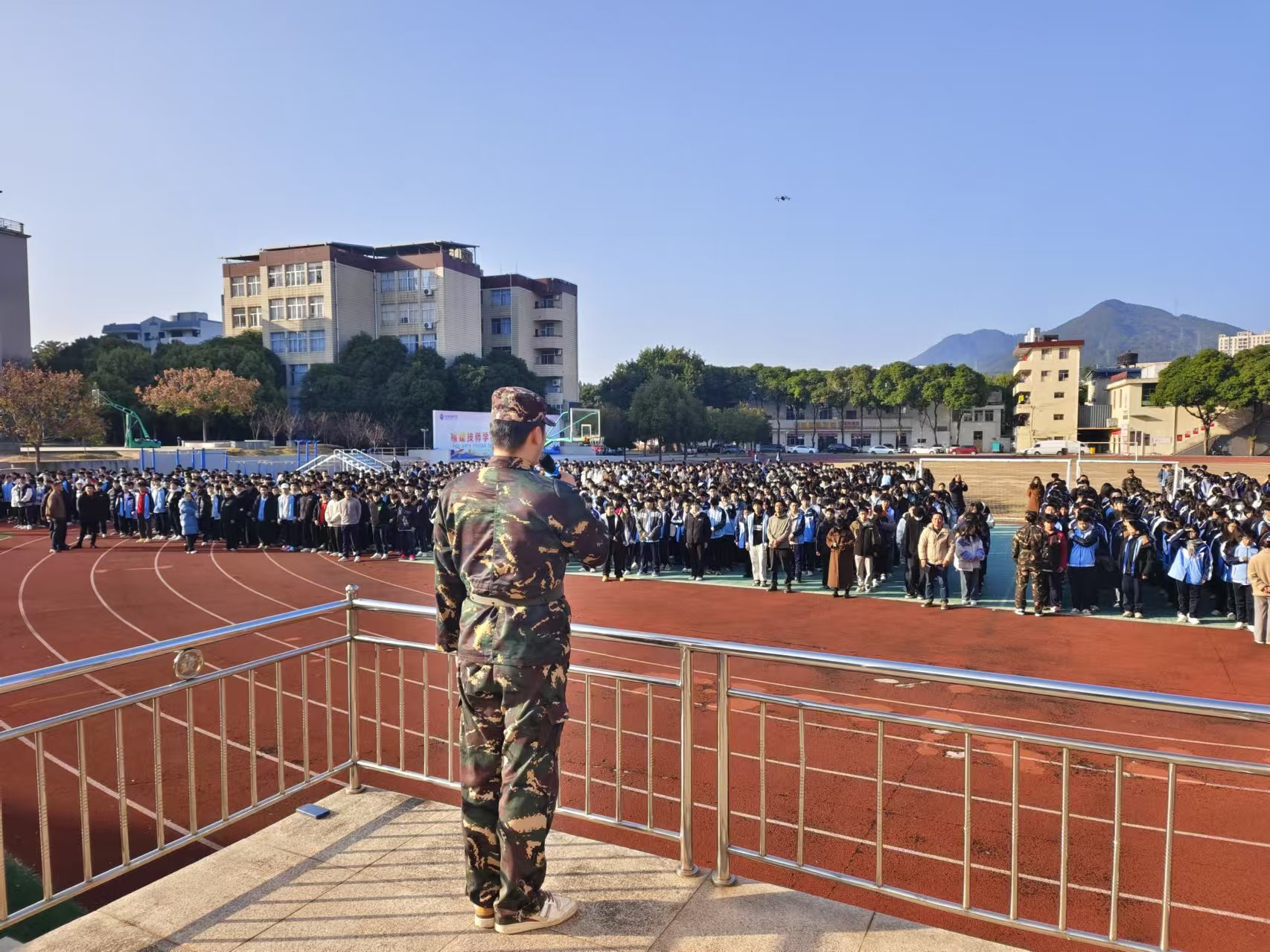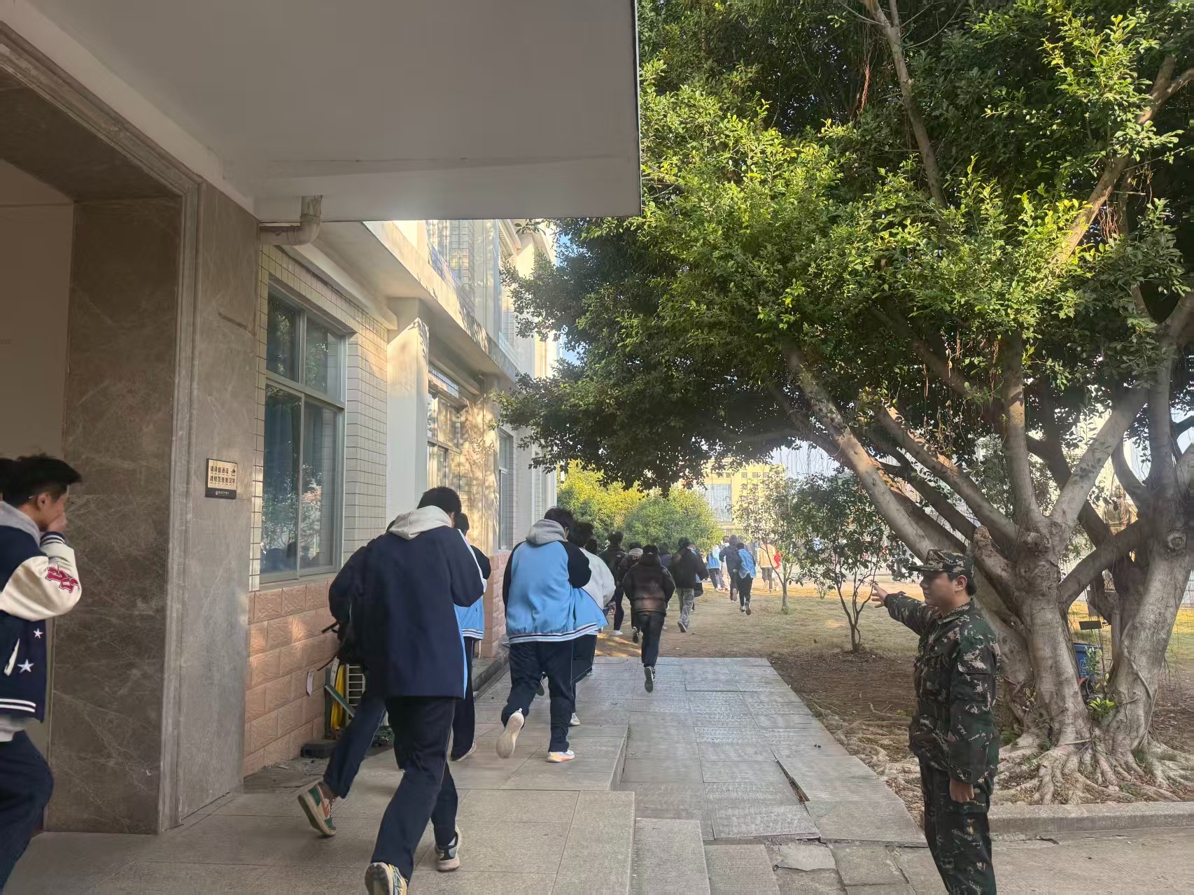 事前,学生科制定了详细的演练方案,明确划分责任区域布置,班主任详细讲解演练过程要求。下午15:30警报信号准时响起,在班主任、教官及学生志愿者的引导下,学生们弯腰低姿、捂住口鼻,迅速到达田径运动场集结区,班干部协同教官清点人数并及时上报,整个疏散过程规范高效。期间,现场救护小组随时待命。