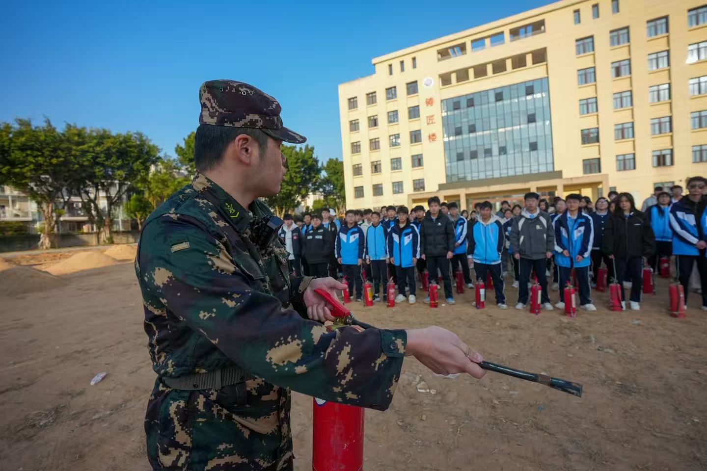 教官现场示范灭火器正确使用要领,详细讲解操作步骤与安全注意事项。部分学生代表逐一实操,亲身感受灭火过程,切实掌握灭火器使用技能,达到“学用结合”的演练目的。